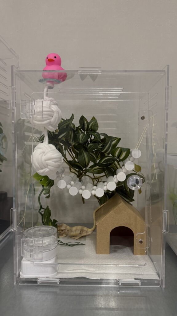 은신처의 위치를 바꾸고, 모래를 새로 깔아주고, 조명 불빛을 살짝 줄였다.